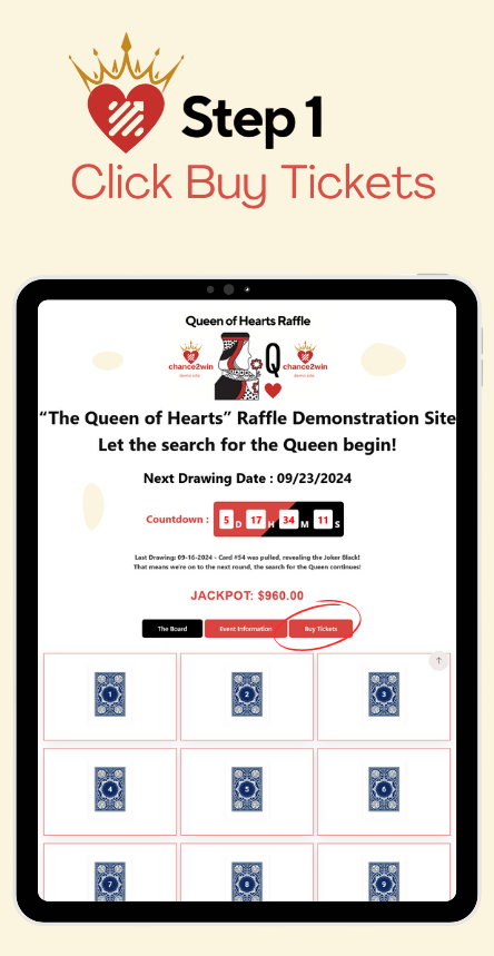The Jackpot will continue to accumulate weekly (progressively) less previous awarded amounts listed above and raffle processing expenses. This Grand Prize Pool/Jackpot will roll over each week until the Queen of Hearts Card is drawn. The Jackpot amount will be updated and displayed continually online while tickets are being sold. If the Queen of Hearts playing card is revealed, the raffle ends and a new raffle will begin. Any recurring purchase transactions will stop once the raffle ends.